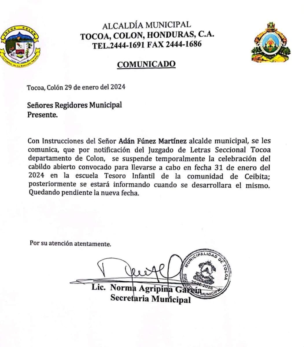Tocoa ,Colón Por notificación del Juzgado de Letras Seccional de esta ciudad ,se suspende temporalmente la celebración del Cabildo Abierto convocado para llevarse a cabo en fecha 31 de enero de 2024 en la escuela Tesoro Infantil de la comunidad de Ceibita.