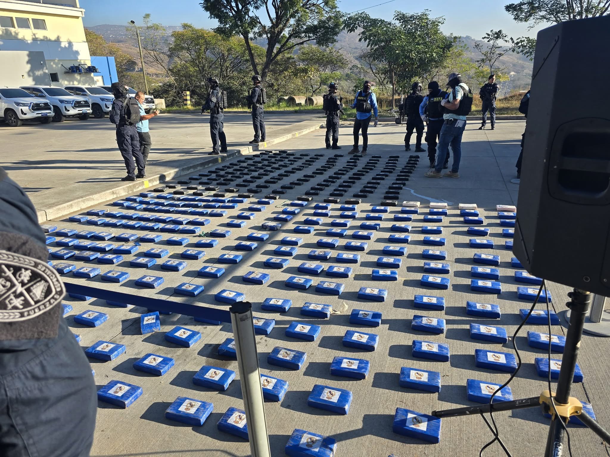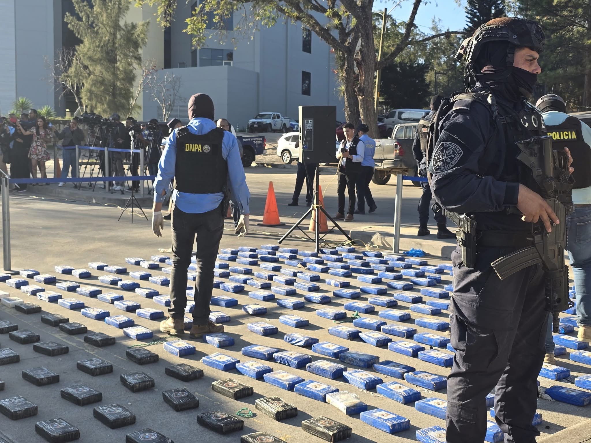 El conteo y presentación se realizó en las instalaciones de la Secretaría de Seguridad en Tegucigalpa hasta donde fue trasladado el fuerte cargamento del alucinógeno. Los especialistas de la Dirección Policial Antidrogas (DNPA), identificaron marquillas con logos de un capitán marinero y de un equipo de futbol de España.