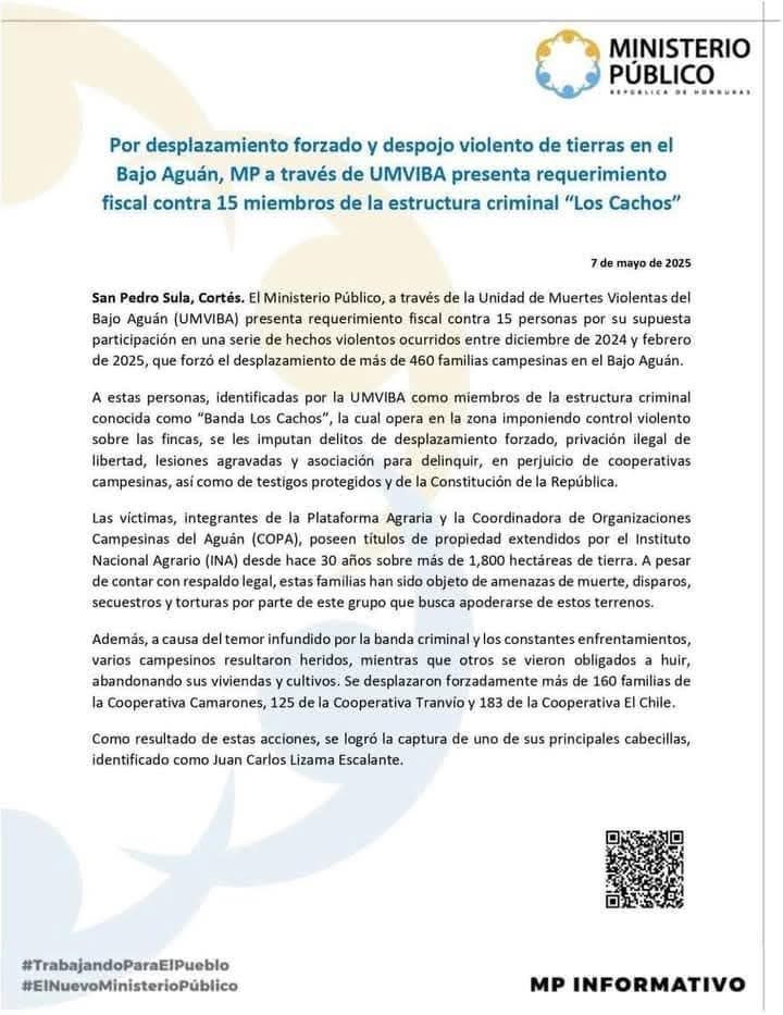 Colón – Por su supuesta participación en una serie de hechos violentos ocurridos entre diciembre del 2024 y febrero del 2025, forzando el desplazamiento de más de 460 familias campesinas en el Bajo Aguán, 15 integrantes de la banda criminal “Los Cachos” fueron acusados por el Ministerio Público (MP), a través de la Unidad de Muertes Violentas del Bajo Aguán (UMVIBA).