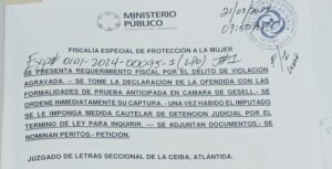 La Fiscalía Especial de Protección a la Mujer presentó requerimiento fiscal contra Luis Fernando Triminio, fiscal auxiliar asignado al Centro Integrado (CEIN) de La Ceiba, por presunto delito de violación agravada en perjuicio de una joven de 22 años, ecto sucedido en la oficina de turno del fiscal, que hoy es un prófugo de la justicia.