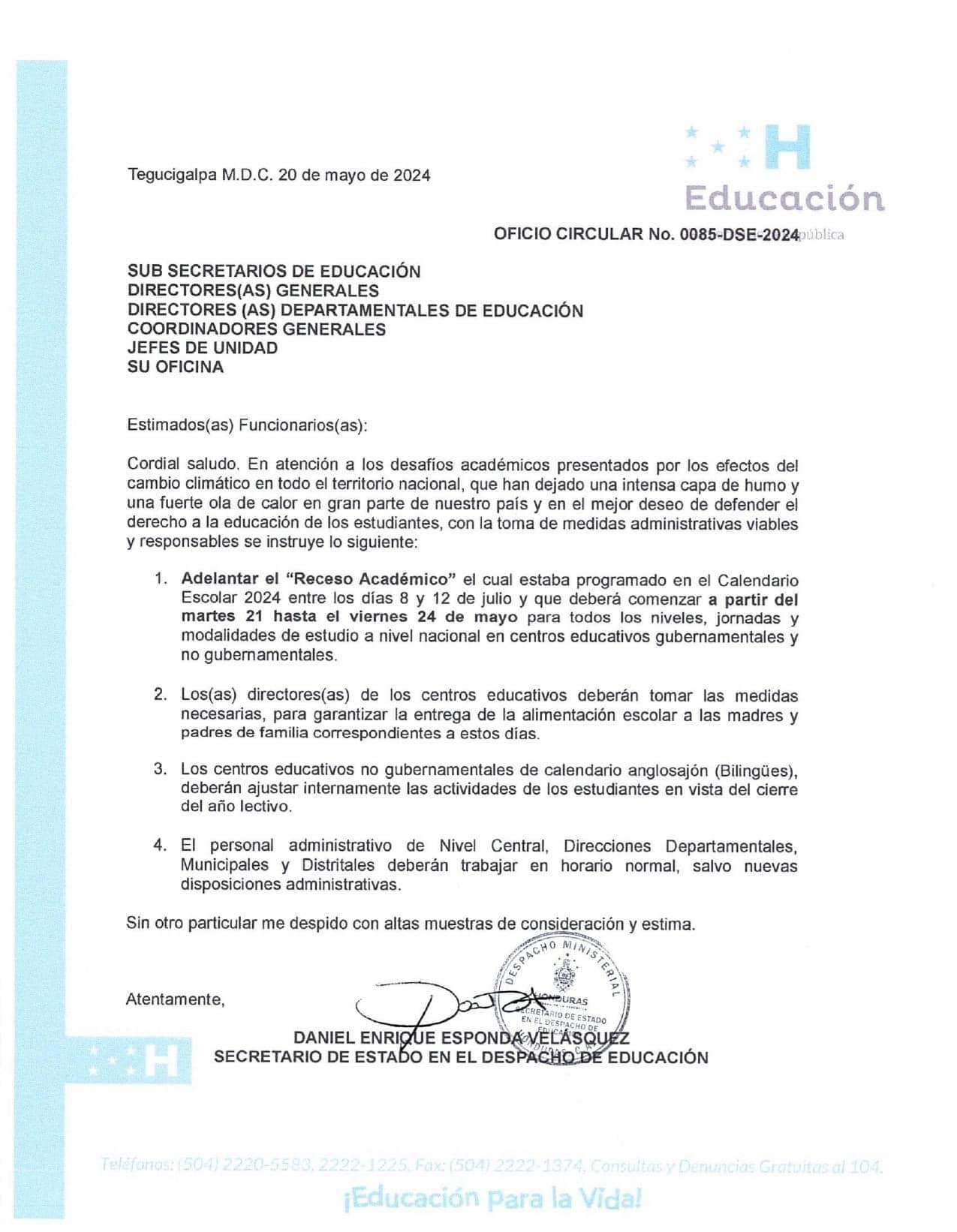 Tegucigalpa.- Por contaminación y altas temperaturas, Secretaría de Educación adelanta el «Receso Académico”, el cual estaba programado entre los días 8 y 12 de julio y que deberá comenzar a partir del mañana martes 21 hasta el viernes 24 de mayo.