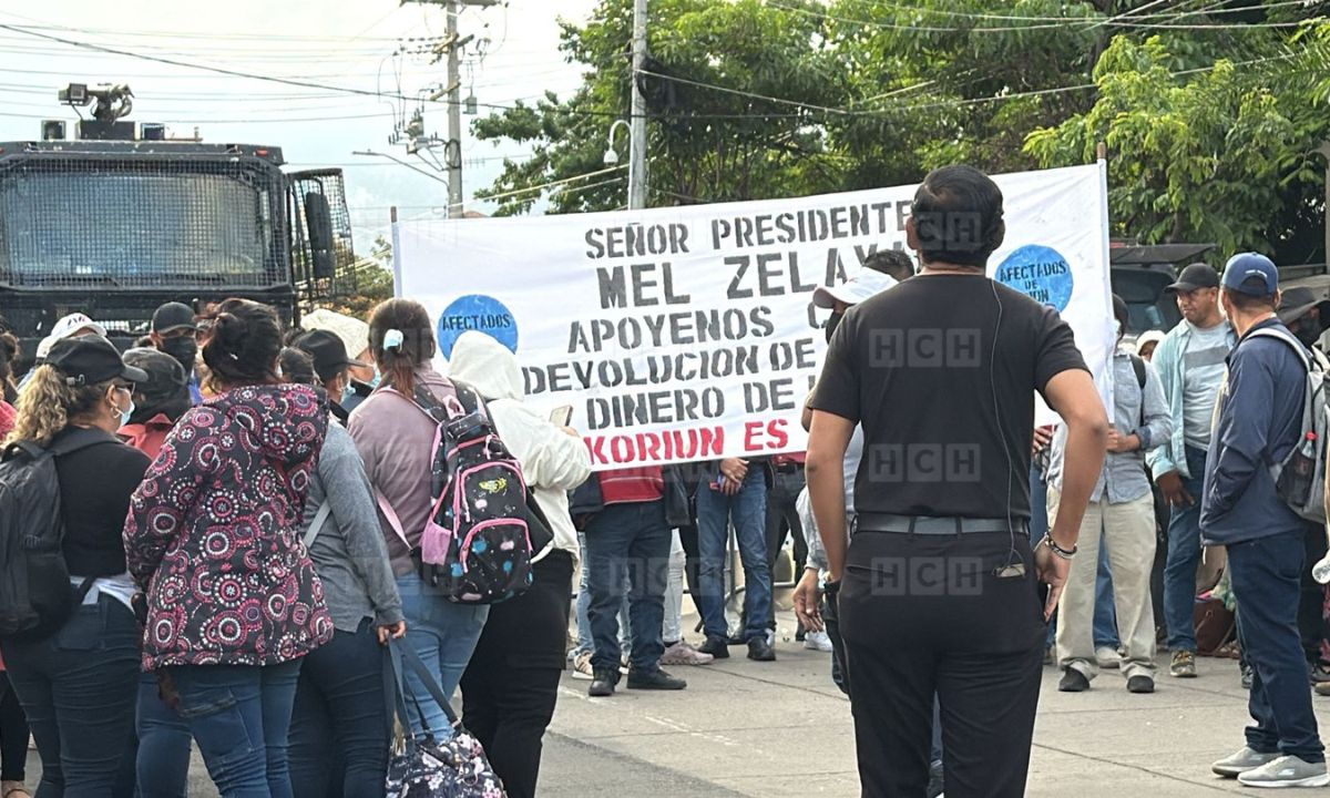 Tegucigalpa- Continúan las protestas de socios e inversionistas de la plataforma Koriun frente a Casa Presidencial, en Tegucigalpa, en exigencia de una pronta respuesta del Gobierno ante la falta de devolución de sus ahorros