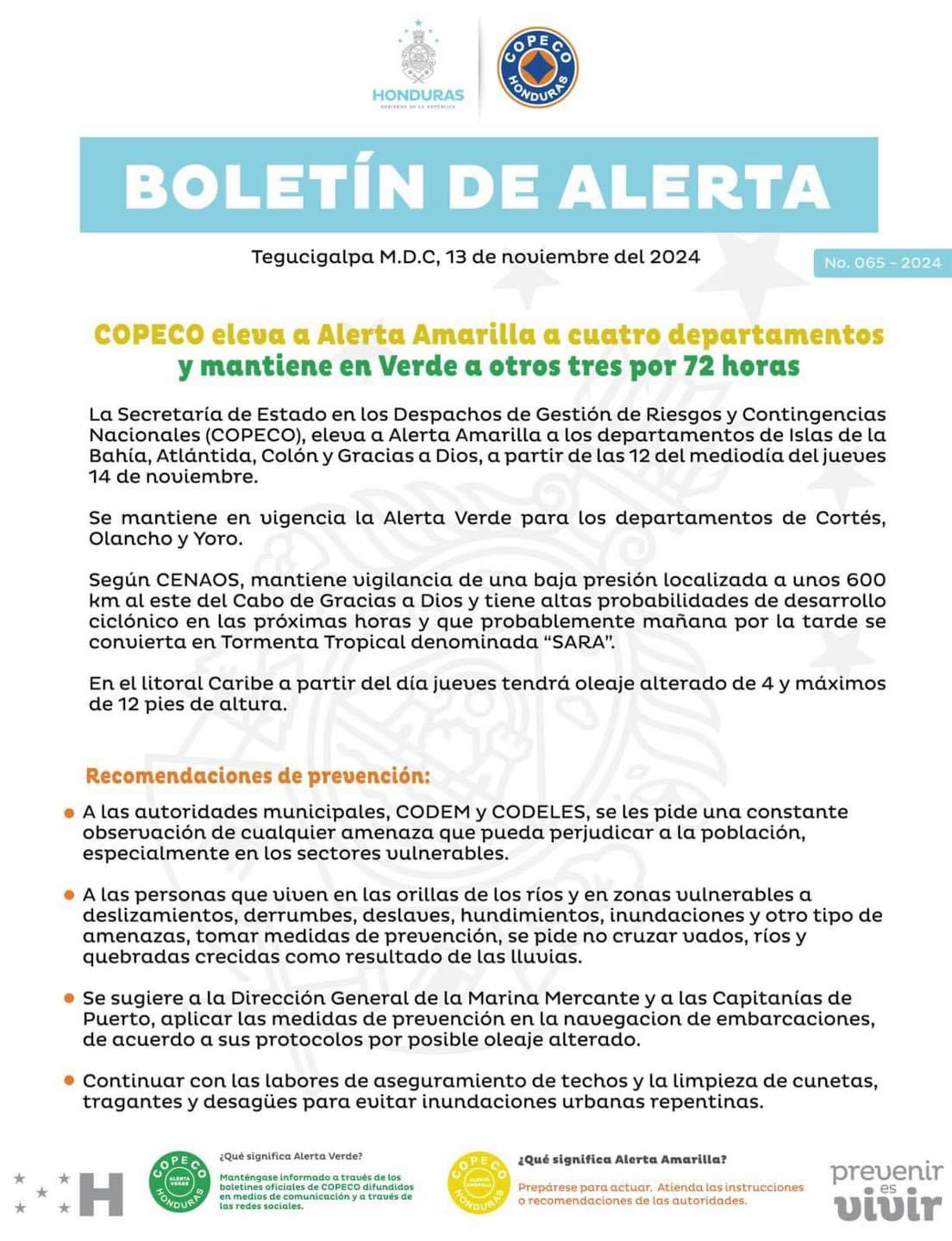 Copeco elevó a alerta amarilla a cuatro departamentos debido a el fenómeno natural que se está acercando , ya hay intensas lluvias en Islas de la Bahía que están provocando inundaciones .