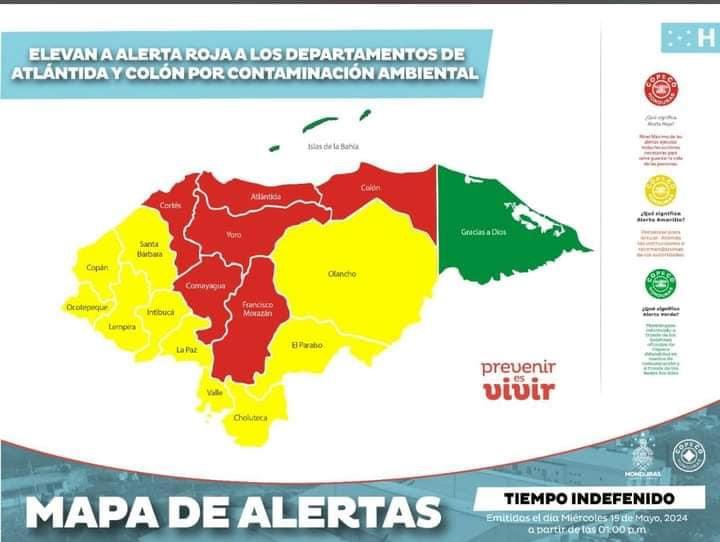 Tegucigalpa- La Comisión Permanente de Contingencias (Copeco) ha elevado a Alerta Roja los departamentos de Atlántida y Colón debido a los altos niveles de contaminación atmosférica. La medida se toma en respuesta a la mala calidad del aire causada por una densa capa de humo, incendios forestales y la falta de lluvias en la región.