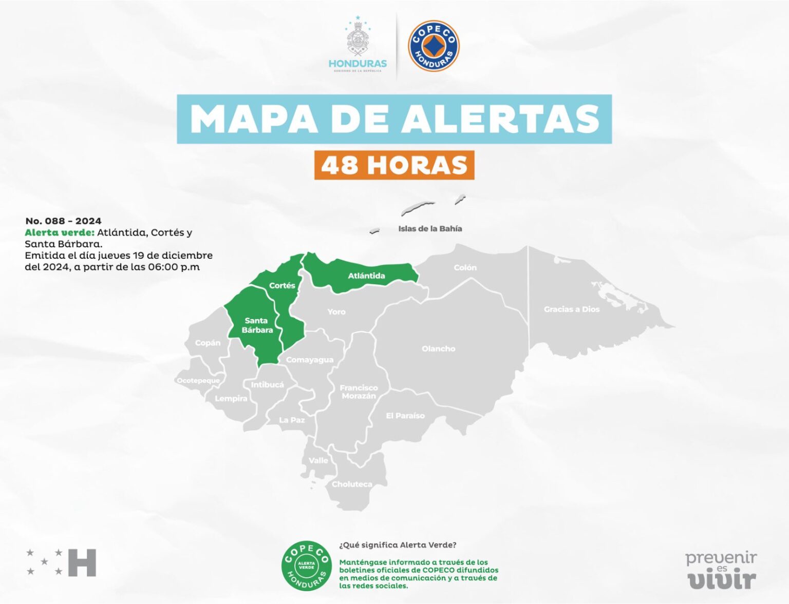 La Secretaría de Estado en los Despachos de Gestión de Riesgos y Contingencias Nacionales (COPECO) declara Alerta Verde para los departamentos de Santa Bárbara, Cortés y Atlántida, por un período de 48 horas a partir de las 6 de la tarde de hoy, jueves 19 de diciembre de 2024.