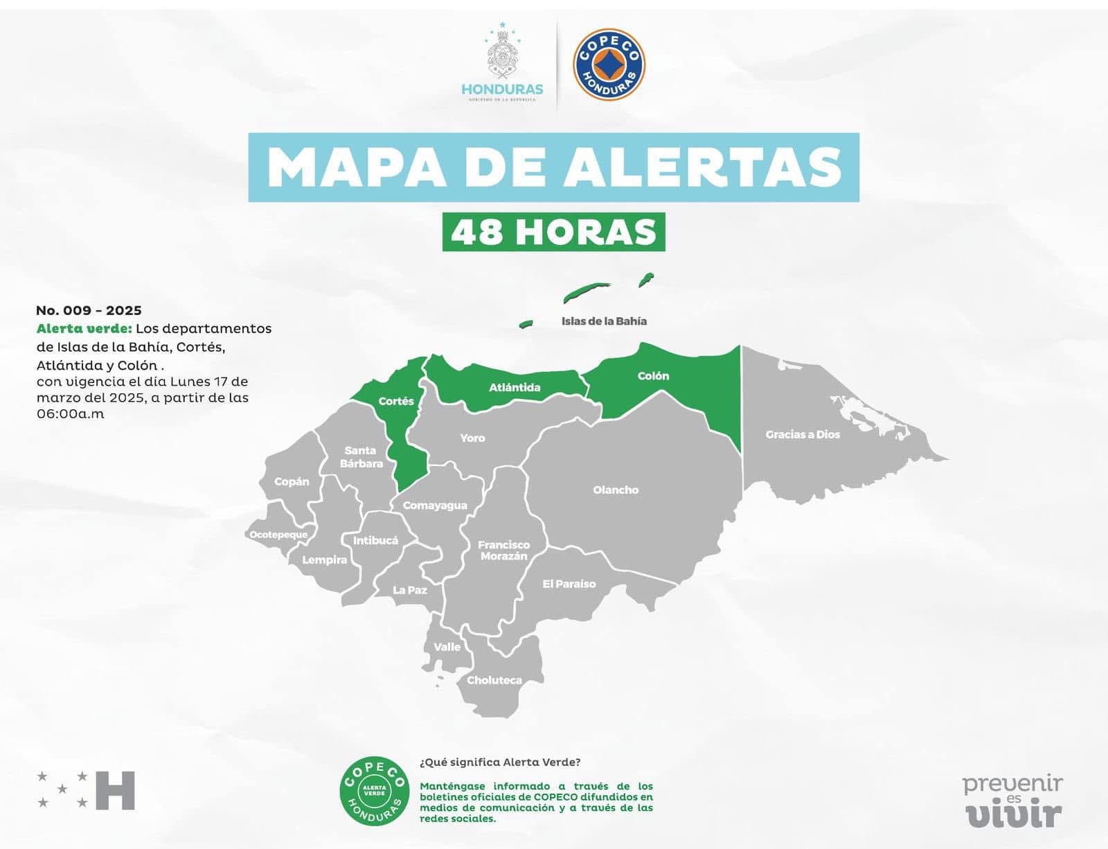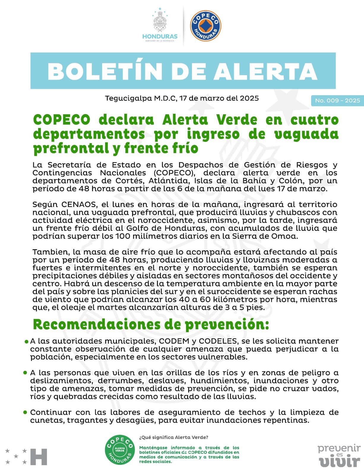 Clima/PortadaAlerta verde para Colón y otros tres departamentos por ingreso de vaguada y frente frío by Redacción - H17 de marzo de 2025884 views1 min readTegucigalpa- Copeco declara Alerta Verde en 4 departamentos del país por ingreso de vaguada y frente frío.Aunque hemos tenido temperaturas altas , se anuncia la llegada de lluvias en 4 departamentos entre ellos Colón . Share this Facebook Messenger Whatsapp Email