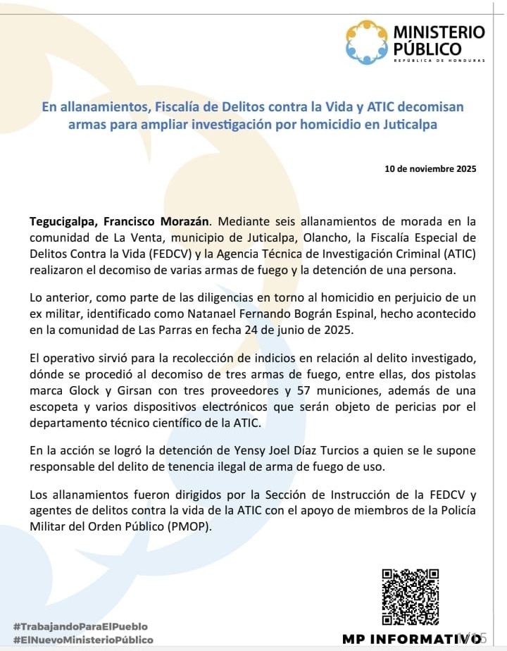 En una serie de seis allanamientos ejecutados en la comunidad de La Venta, municipio de Juticalpa, Olancho, la Fiscalía Especial de Delitos Contra la Vida (FEDCV) y la Agencia Técnica de Investigación Criminal (ATIC) lograron el decomiso de varias armas de fuego y la detención de una persona vinculada a un caso de homicidio.
