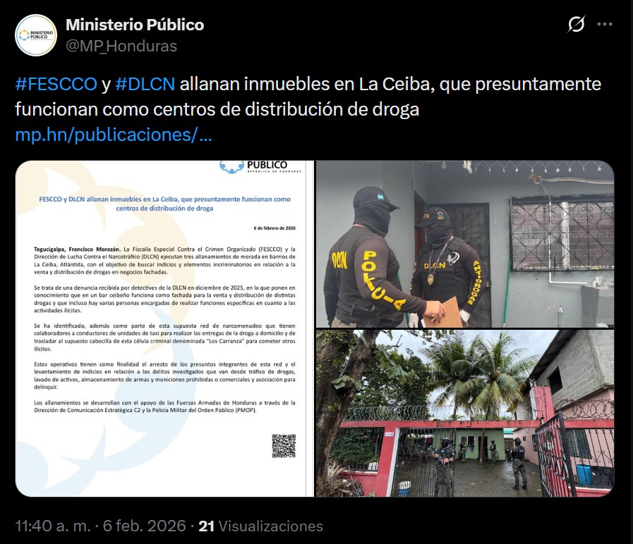 La Fiscalía Especial Contra el Crimen Organizado (FESCCO), en coordinación con la Dirección de Lucha Contra el Narcotráfico (DLCN), ejecuta este viernes tres allanamientos de morada en distintos barrios de La Ceiba, Atlántida, como parte de una investigación relacionada con la venta y distribución de drogas a través de negocios que operaban como fachada.