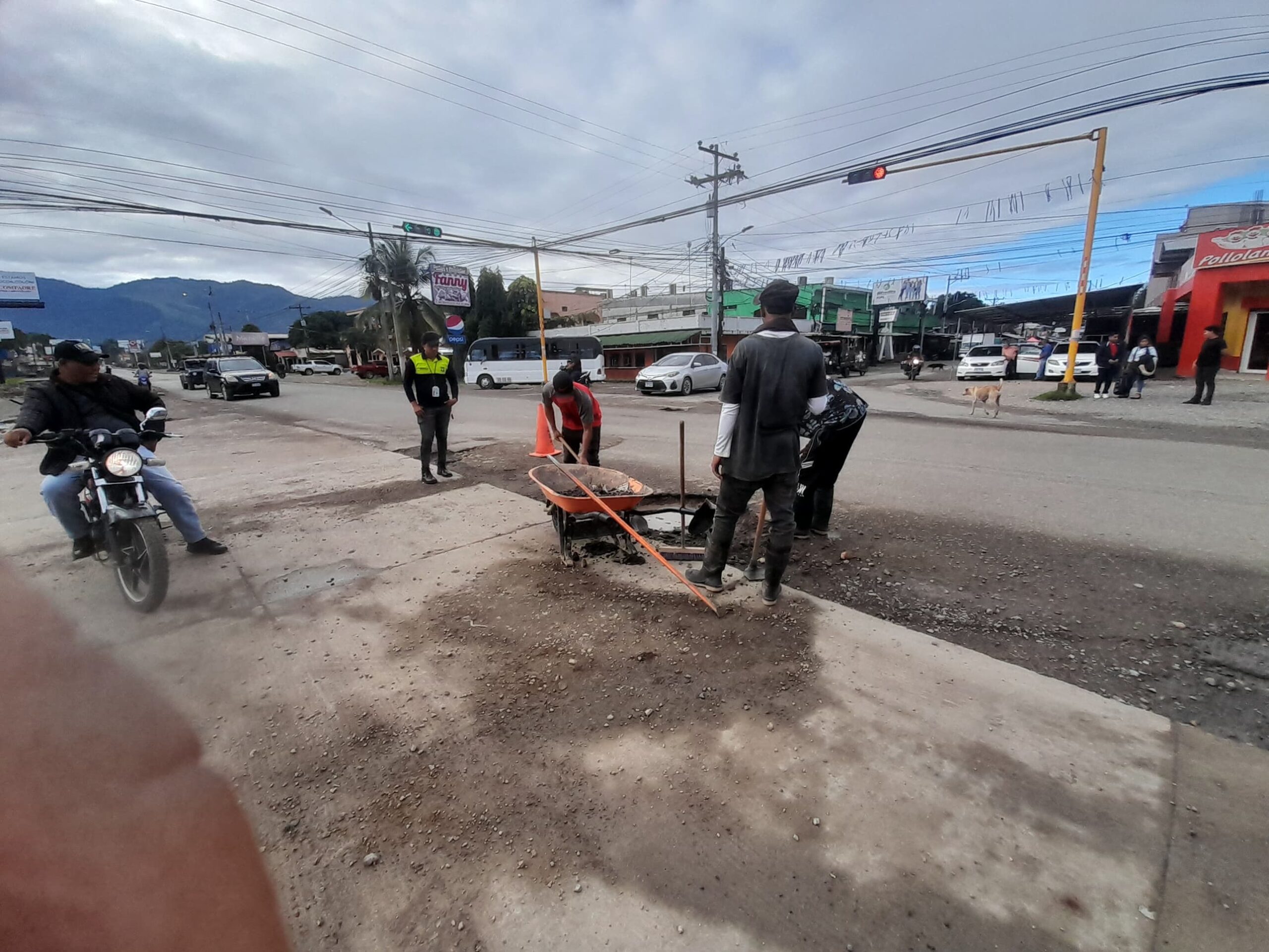 Una. Cuadrilla de la Alcaldía Municipal realiza el bacheo con cemento , a la espera el próximo año de un trabajo del Gobierno.