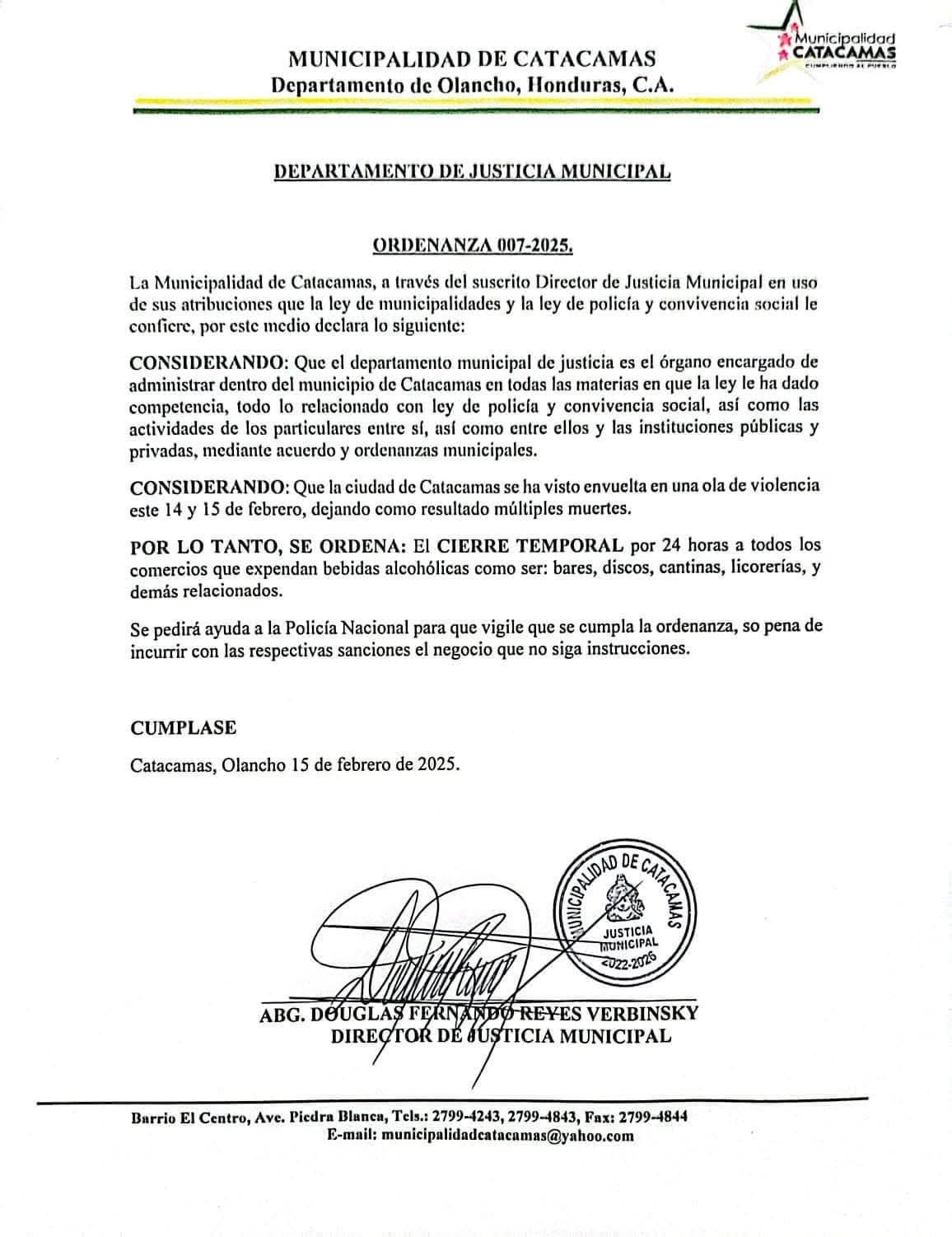Catacamas, Olancho.- Declaran un cierre temporal de 24 horas para todos los comercios que expenden bebidas alcohólicas, ante últimos hechos violentos en el municipio.