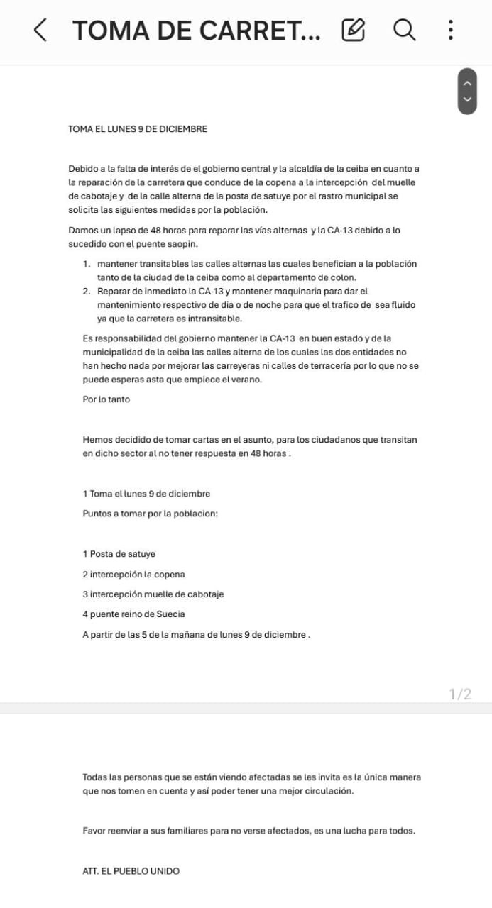 “Damos un lapso de 48 horas para que el Gobierno repare las vías alternas y la carretera CA 13 , debido a lo que pasó en el puente Saopin.” dice el comunicado.