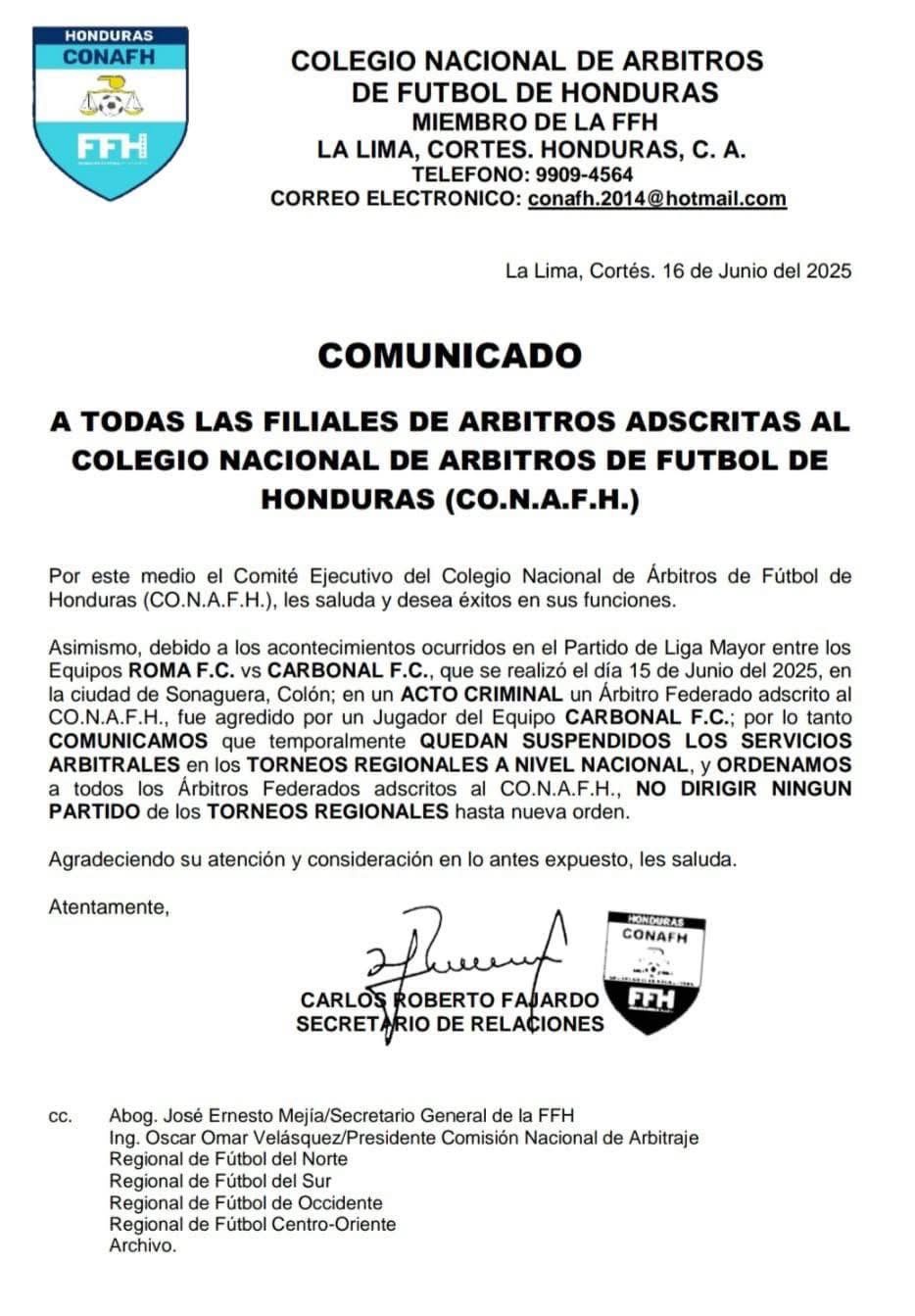 San Pedro Sula –  El Colegio Nacional de Árbitros de Fútbol de Honduras (CO.N.A.F.H.) anunció este lunes la suspensión temporal de todos los servicios arbitrales en torneos regionales a nivel nacional, tras un violento incidente ocurrido en Sonaguera, Colón.