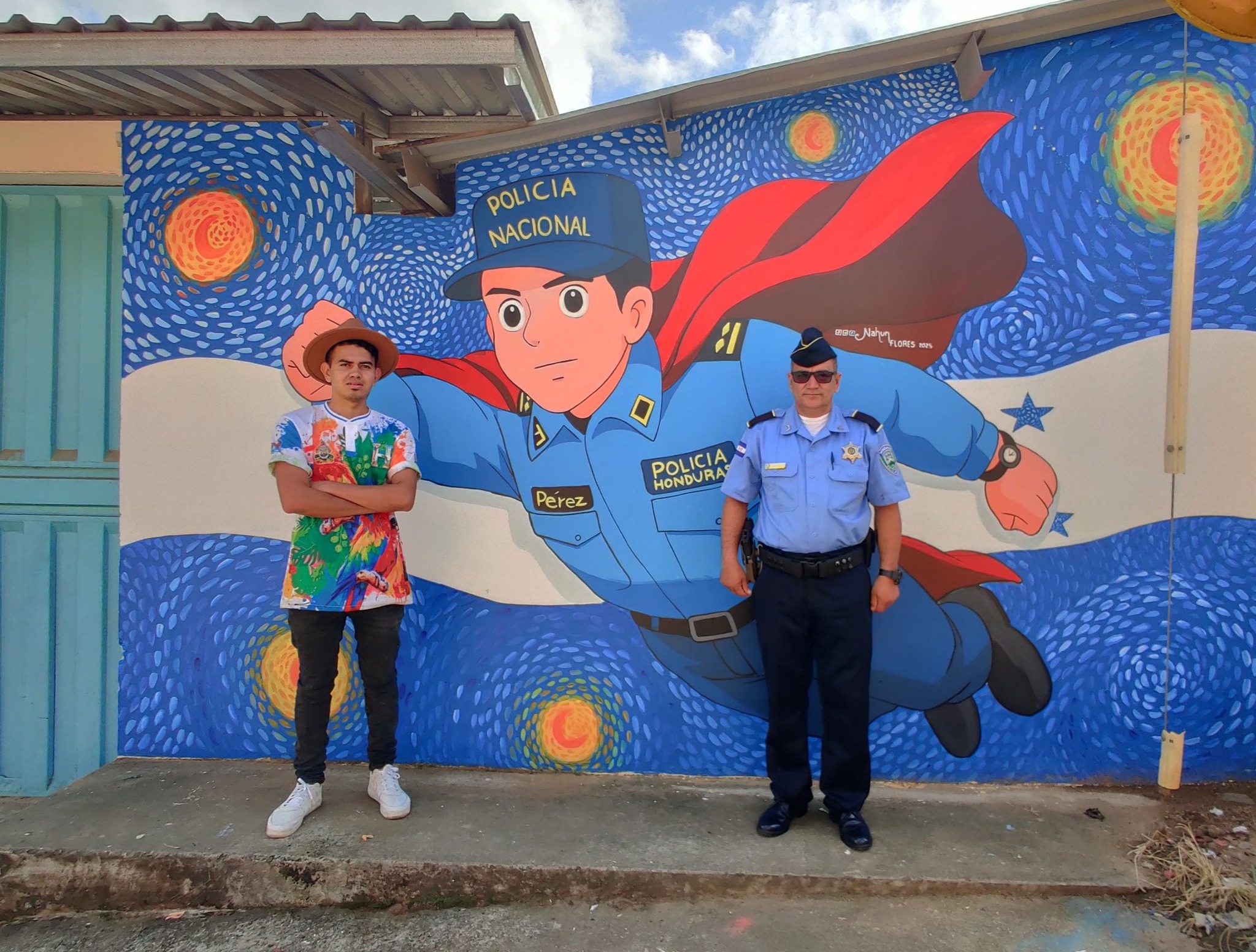 El artista hondureño Nahún Flores inauguró un emotivo mural en la jefatura municipal de Campamento, Olancho, en honor al inspector de la Policía Nacional Kevin Pérez, quien perdió la vida el 14 de septiembre mientras intentaba rescatar a dos niños arrastrados por una fuerte corriente en San Pedro Sula.