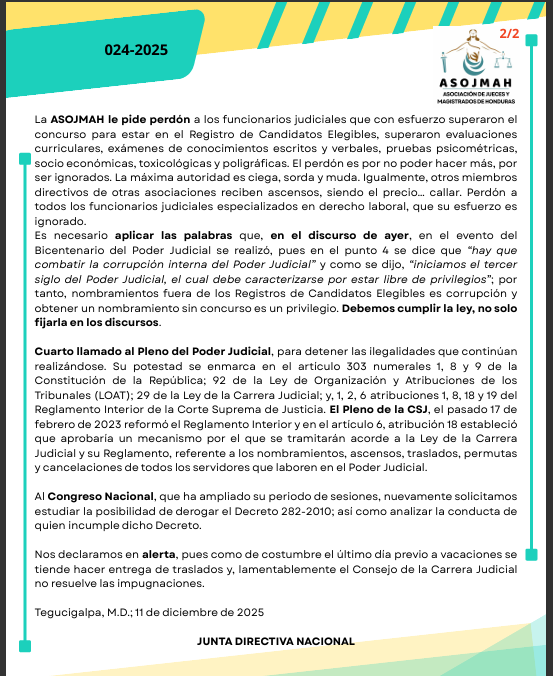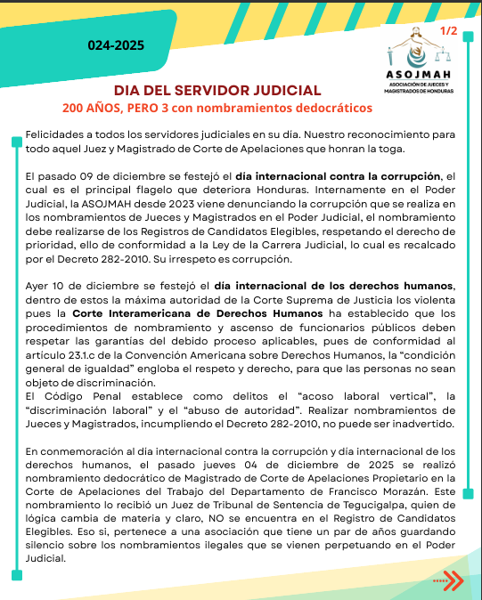 La Asociación de Jueces y Magistrados de Honduras (Asojmah) felicitó a los servidores judiciales en su día, al tiempo que reiteró denuncias sobre actos de corrupción en los procesos de nombramiento de jueces y magistrados.