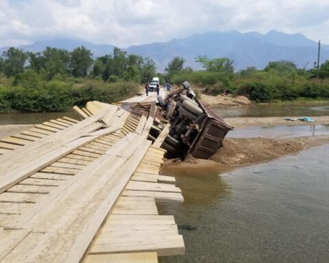 Olanchito. Una volqueta que intentó cruzar un puente de madera sobre el río Aguán, cargada de arena, se dio vuelta, luego que la estructura no soportó su peso. El accidente sucedió en la mañana de este viernes, en el municipio de Arenal,