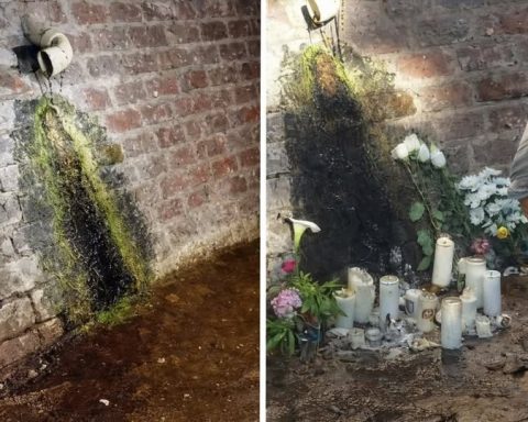 Una imagen captada en México ha generado polémica en redes sociales luego de que varias personas colocaran veladoras, flores y objetos religiosos frente a una simple mancha de humedad en una pared de ladrillo, la cual algunos aseguran “tiene la forma” de