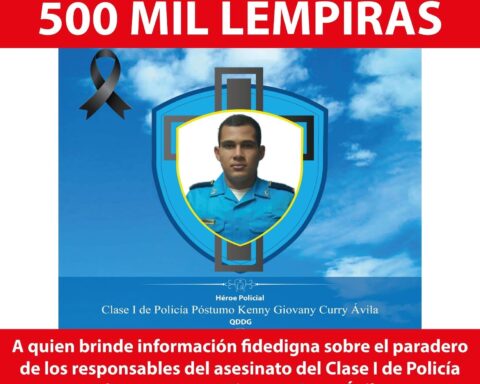 Tegucigalpa- La Secretaría de Seguridad a través de la Policía Nacional ofrece 500 mil lempiras de recompensa por información que ayude a dar con el paradero de los responsables de la emboscada en la que falleció el agente policial Kenny Curry en