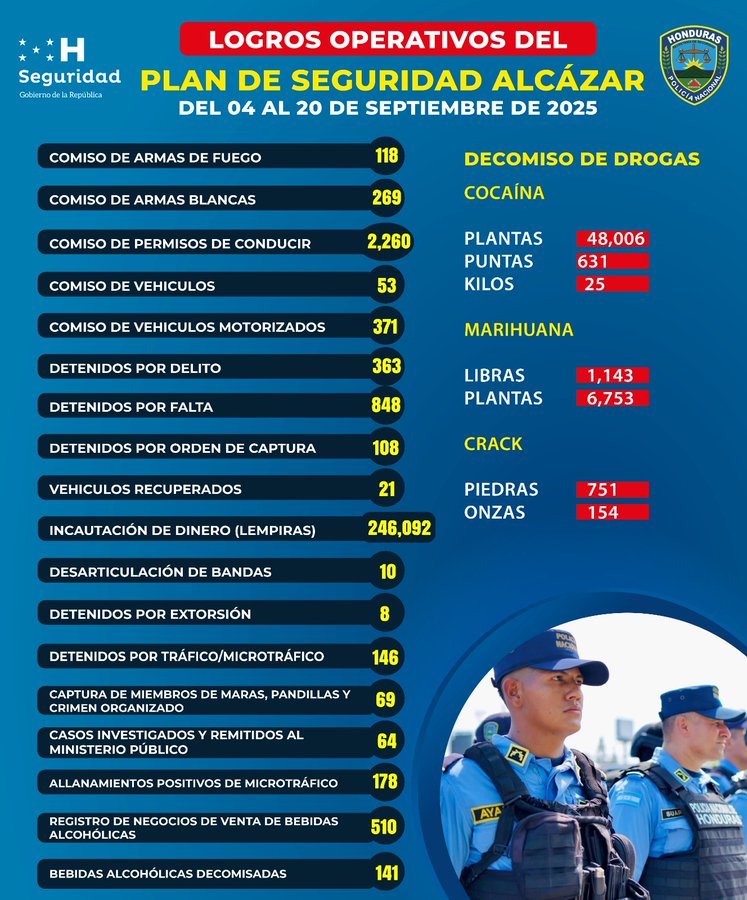 La cocaína se ha convertido en un símbolo de la violencia y la ilegalidad que atraviesa Honduras. Solo en los primeros 16 días de septiembre de 2025, las autoridades incautaron 25 kilos de cocaína en operativos realizados bajo el “Plan Alcázar”, una estrategia que busca cerrar espacios al crimen organizado en barrios, carreteras y fronteras.