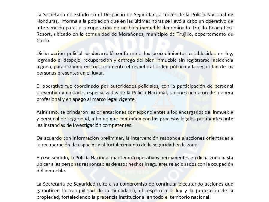 Trujillo, Colón.- Secretaría de Seguridad realiza operativo de intervención para la recuperación de un bien inmueble denominado Trujillo Beach Eco Resort, ubicado en la comunidad de Marañones.
