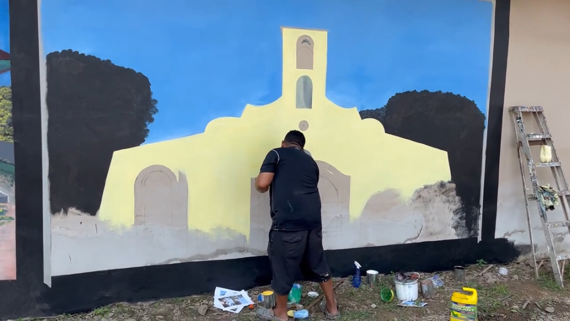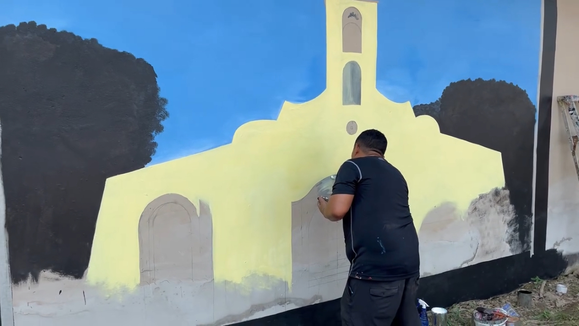 Ahora se está plasmando la histórica iglesia Católica ubicada en el centro de la Ciudad, un lugar que no podía faltar en esta zona de murales .