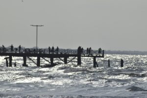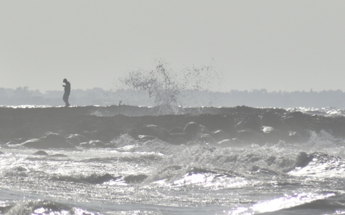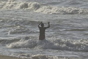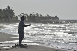 En La Ceiba, pescadores aficionados y bañistas aprovecharon el agitado de las olas del mar para pescar y relajarse.