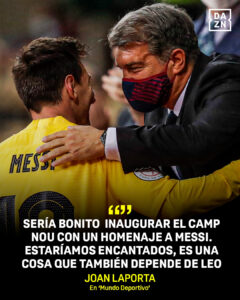 Además, el presidente ha dicho que «lo más bonito sería inaugurar el nuevo Spotify Camp Nou con un homenaje a Leo Messi». «Estoy seguro que le ha llegado a la familia, incluso ya se ha hablado y es una cosa que estaríamos encantados y es una cosa que depende también de Leo y de la familia. Espero que sí», ha agregado.