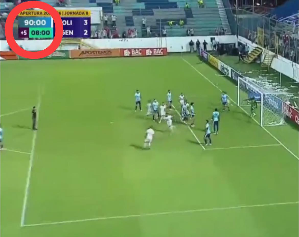 «En el partido de Olimpia-Génesis el árbitro agrega cinco minutos inicialmente y luego dos. Para dejarlo claro, en los tiempos que se agregan también el árbitro puede volver a agregar si él considera que se ha perdido tiempo. Aquí lastimosamente tenemos esta situación clara, el gol del Génesis cae a los 90 minutos con 30 segundos, pero la celebración del jugador, que además fue expulsado, duró dos minutos», indicó en su análisis de la 8 y 9 jornadas.