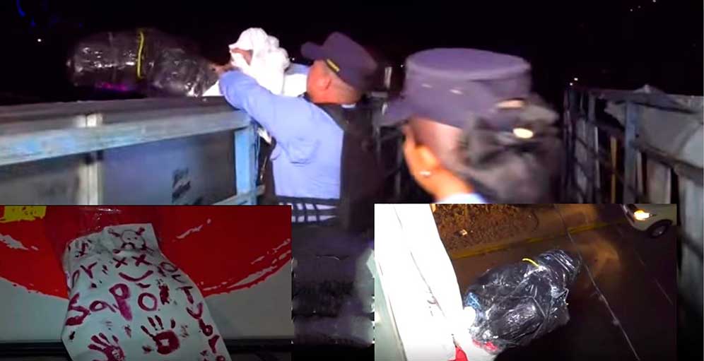 Al llegar al lugar, los agentes encontraron un bulto negro con forma de cuerpo, acompañado de un rótulo que decía: “Por sapo”. Las bolsas estaban manchadas con pintura roja, simulando sangre, lo que inicialmente generó la sospecha de un posible crimen.