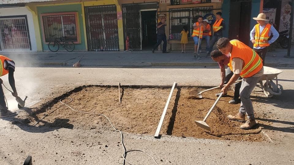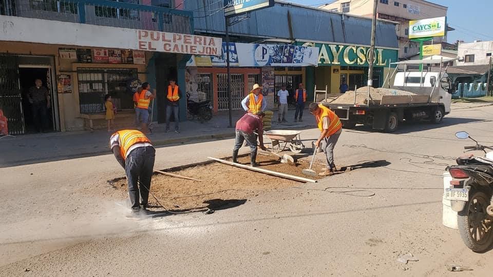 Los miembros de la Cámara de Comercio con pala en mano y varios voluntarios procedieron a reparar el agujero que está en la calle del comercio.