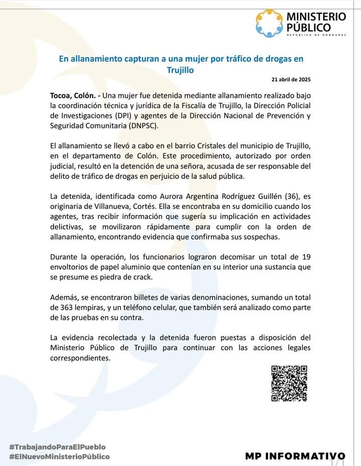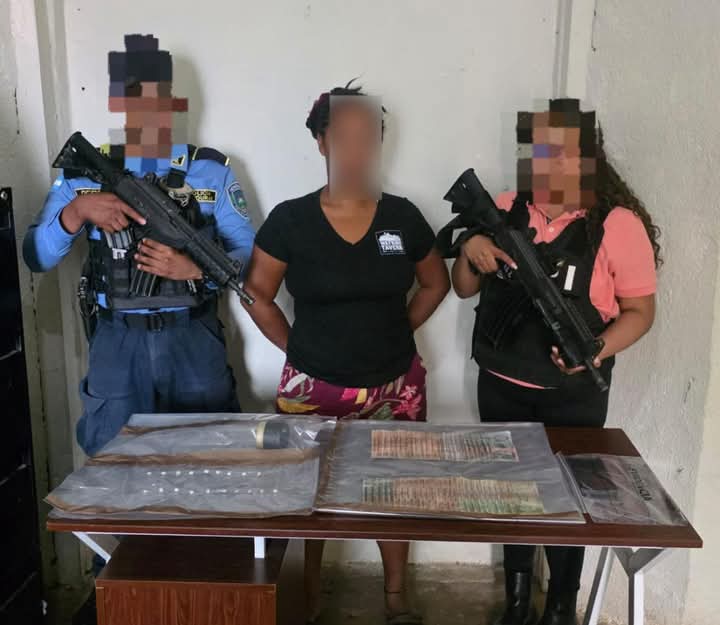 La acción se ejecutó mediante allanamiento con orden judicial en el barrio Cristales del municipio de Trujillo, departamento de Colón. En el lugar fue capturada Aurora Argentina Rodríguez Guillén, de 36 años, originaria de Villanueva, Cortés, quien era investigada por su presunta participación en actividades ilícitas vinculadas al narcomenudeo.