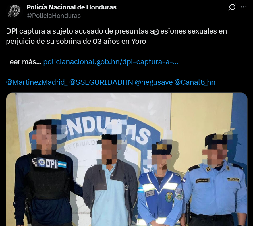 Tras llevar a cabo trabajos de seguimiento y vigilancia,por parte de agentes asignados a la Unidad Departamental de Investigación Criminal #18 (UDIC-18),de la DPI en conjunto con la Dirección Nacional de Prevención y Seguridad Comunitaria (DNPSC), se logró ubicar y arrestar al sospechoso en la aldea Anselmo Subirana, municipio de Yoro, Yoro