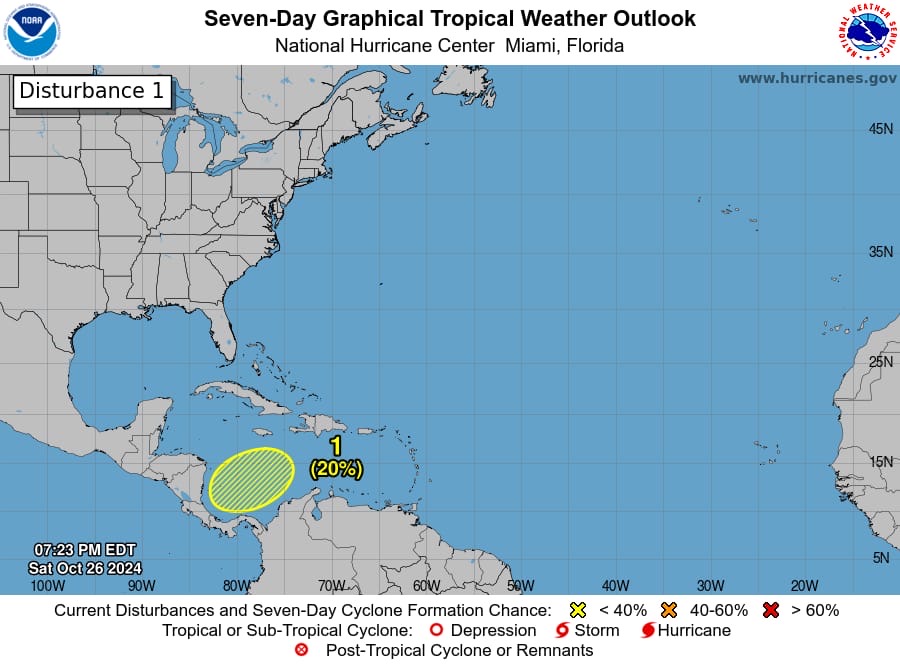Desde esta noche de sábado 26 de octubre, el Centro Nacional de Huracanes comienza a vigilar una zona por un posible desarrollo ciclonico al suoeste del Mar Caribe .
