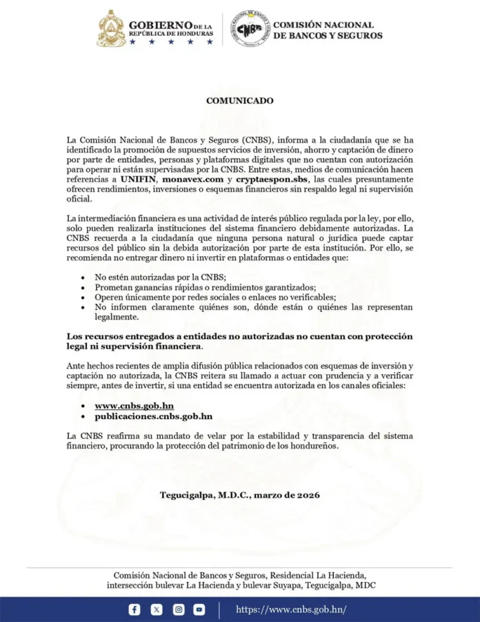 La CNBS recordó que la intermediación financiera es una actividad estrictamente regulada por la ley y que únicamente puede ser ejercida por instituciones debidamente autorizadas, por lo que advirtió a la población sobre los riesgos de invertir en este tipo de plataformas.