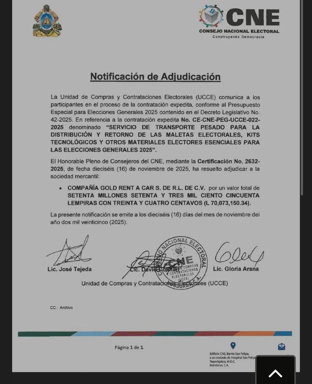 El pleno de consejeros del CNE, mediante la Certificación No. 2632-2025 emitida el 16 de noviembre, resolvió otorgar el contrato a Gold Rent a Car por un monto total de L 70,073,150.34. El servicio incluye la distribución de maletas electorales, kits tecnológicos y equipos complementarios, así como el retorno del material al concluir la jornada electoral.