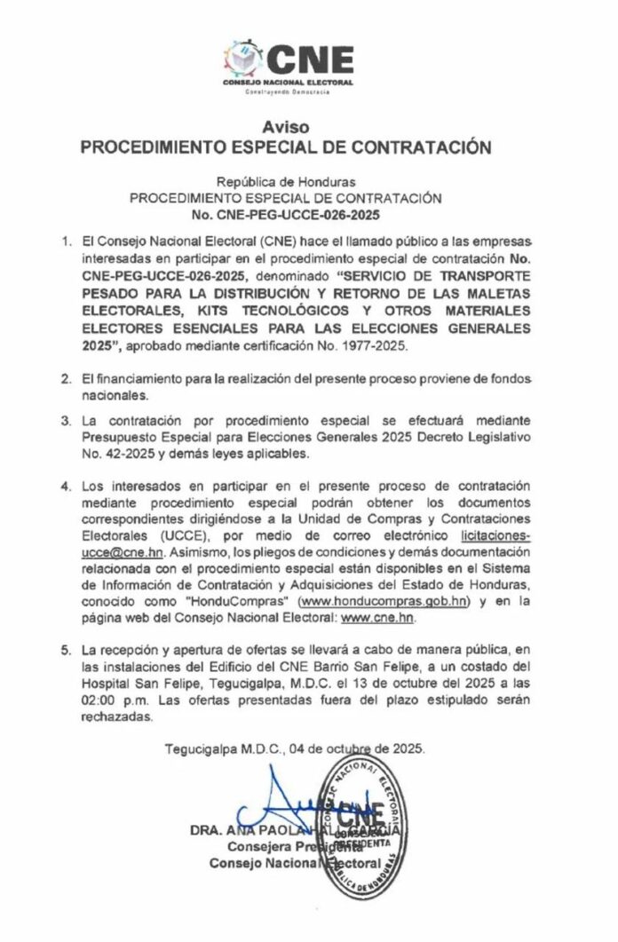 Las bases de la licitación están disponibles a través de la Unidad de Compras y Contrataciones Electorales (UCCE) y en los portales oficiales del CNE y HonduCompras.