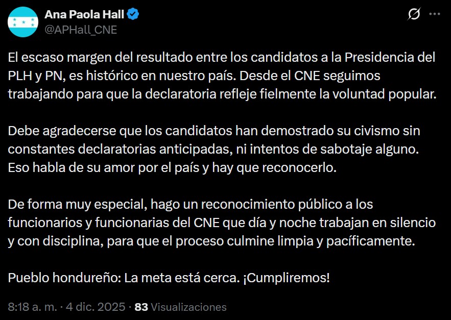 La presidenta del Consejo Nacional Electoral (CNE), Ana Paola Hall, manifestó este jueves que, a pesar del estrecho margen en los resultados de las elecciones generales a nivel presidencial entre Salvador Nasralla, del Partido Liberal, y Nasry Asfura, del Partido Nacional, se trata de un hecho histórico en Honduras.