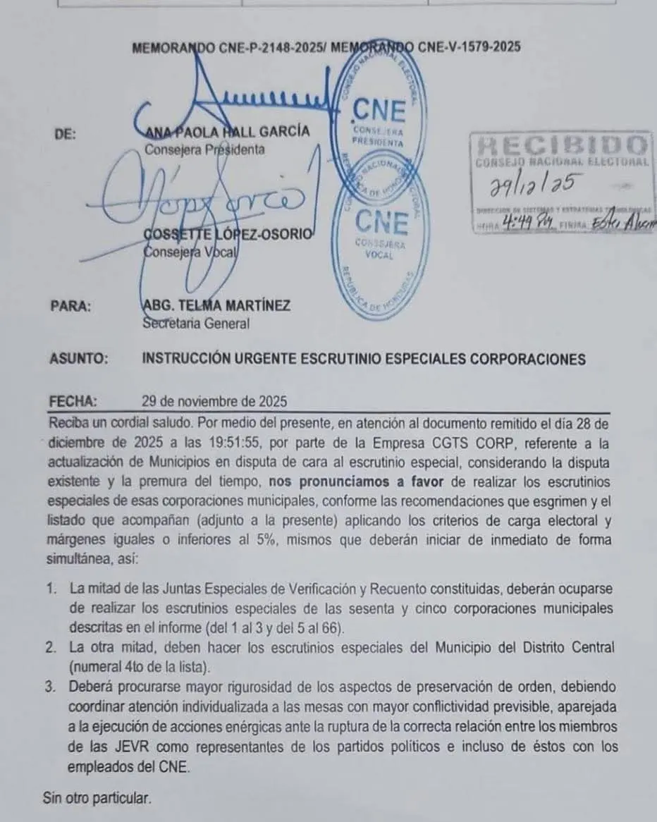 El memorando establece que la mitad de las Juntas Especiales de Verificación y Recuento (JEVR) deberá encargarse de los escrutinios de 65 corporaciones municipales, mientras que la otra mitad se dedicará exclusivamente al Municipio del Distrito Central, debiendo iniciar los procesos de forma inmediata y simultánea.