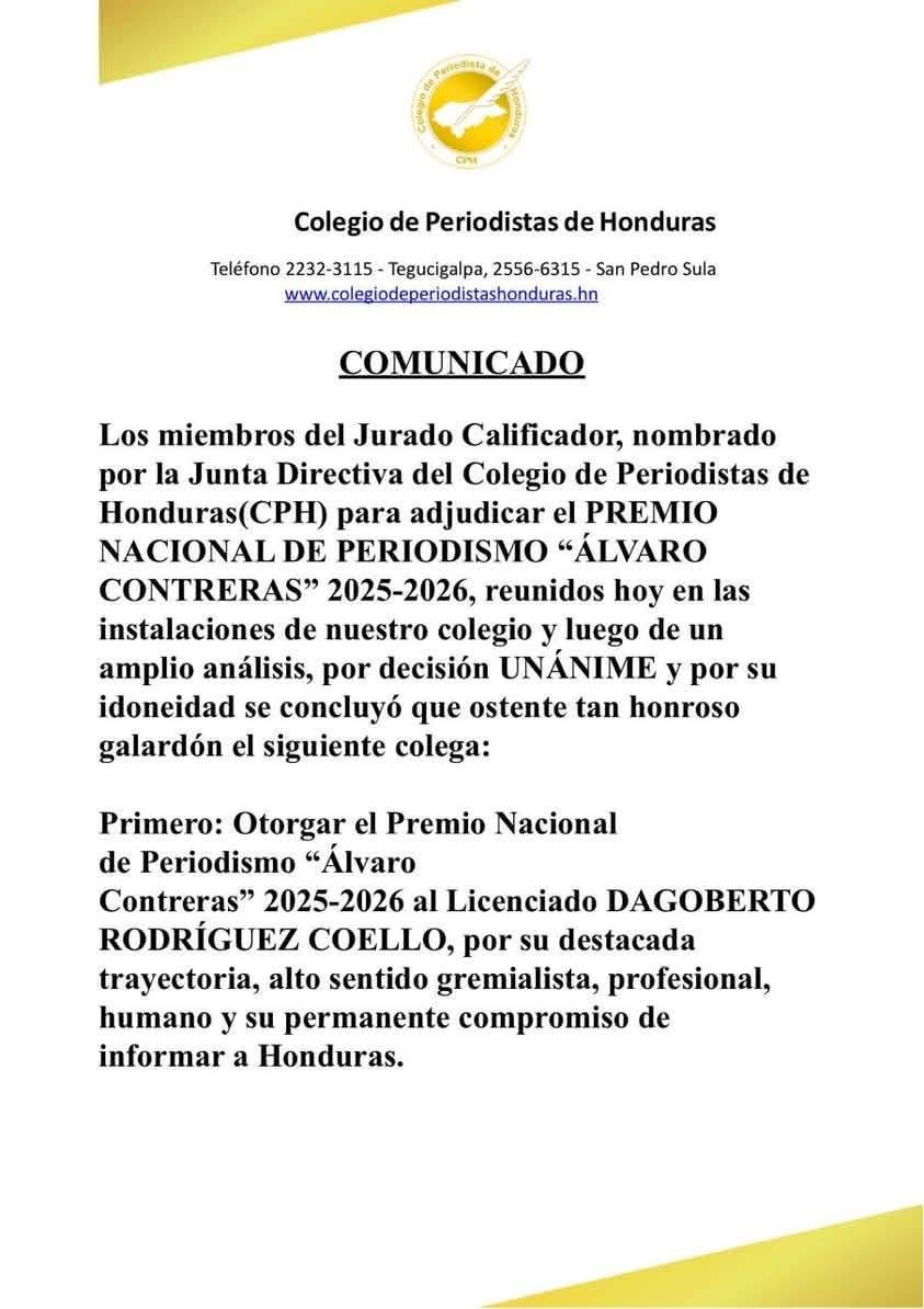 Tegucigalpa- El Colegio de Periodistas de Honduras (CPH), a través de uh comunicado, informó que el premio nacional de periodismo “Álvaro Contreras” 2025-2026 es designado al periodista Dagoberto Rodríguez Coello.