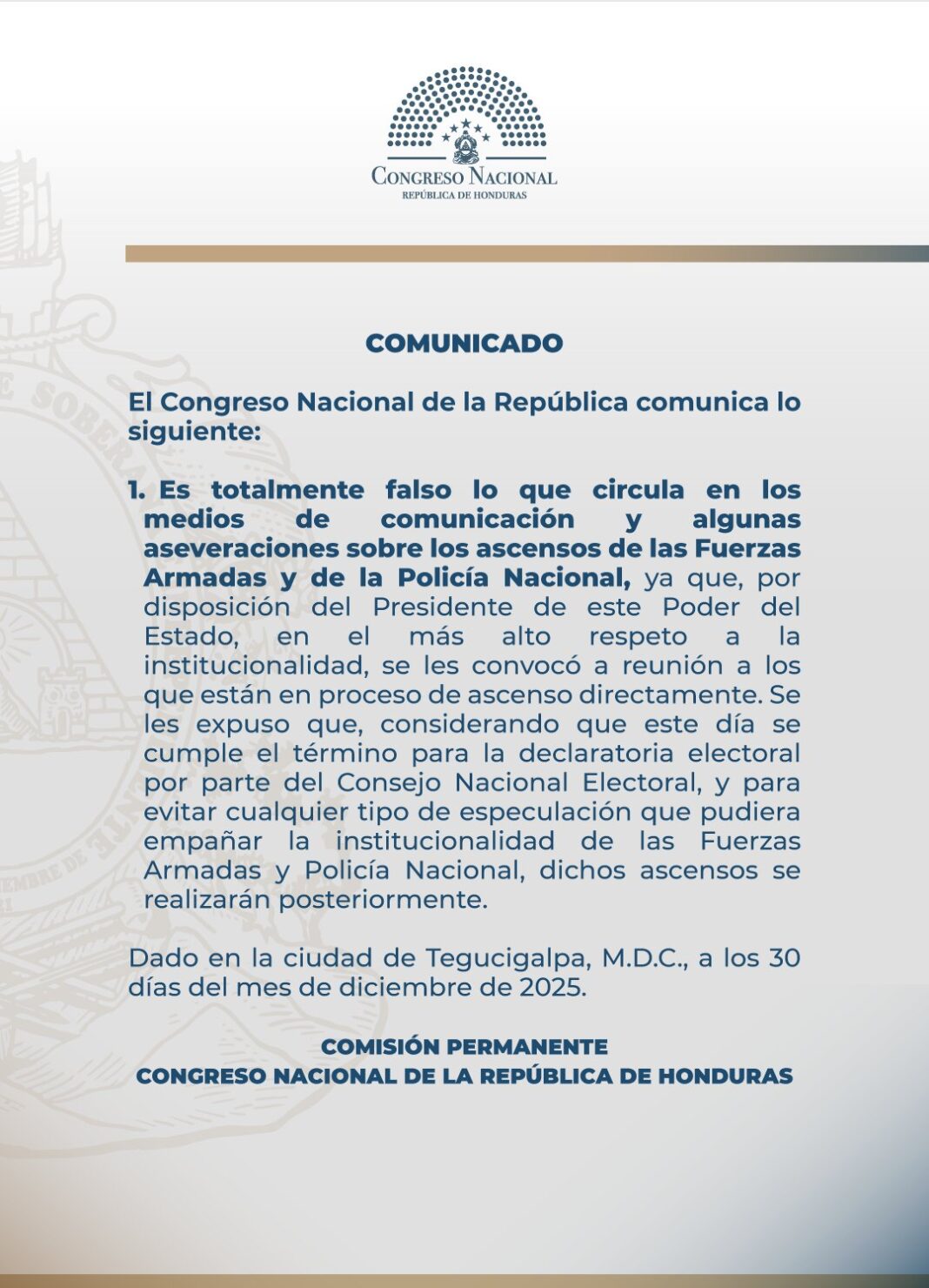 El pronunciamiento se da luego de que, en las últimas horas, se conociera que las Fuerzas Armadas de Honduras declinaron todos los ascensos tras sostener una reunión con la Comisión Permanente del Congreso Nacional, situación que generó diversas reacciones en el ámbito político y militar.