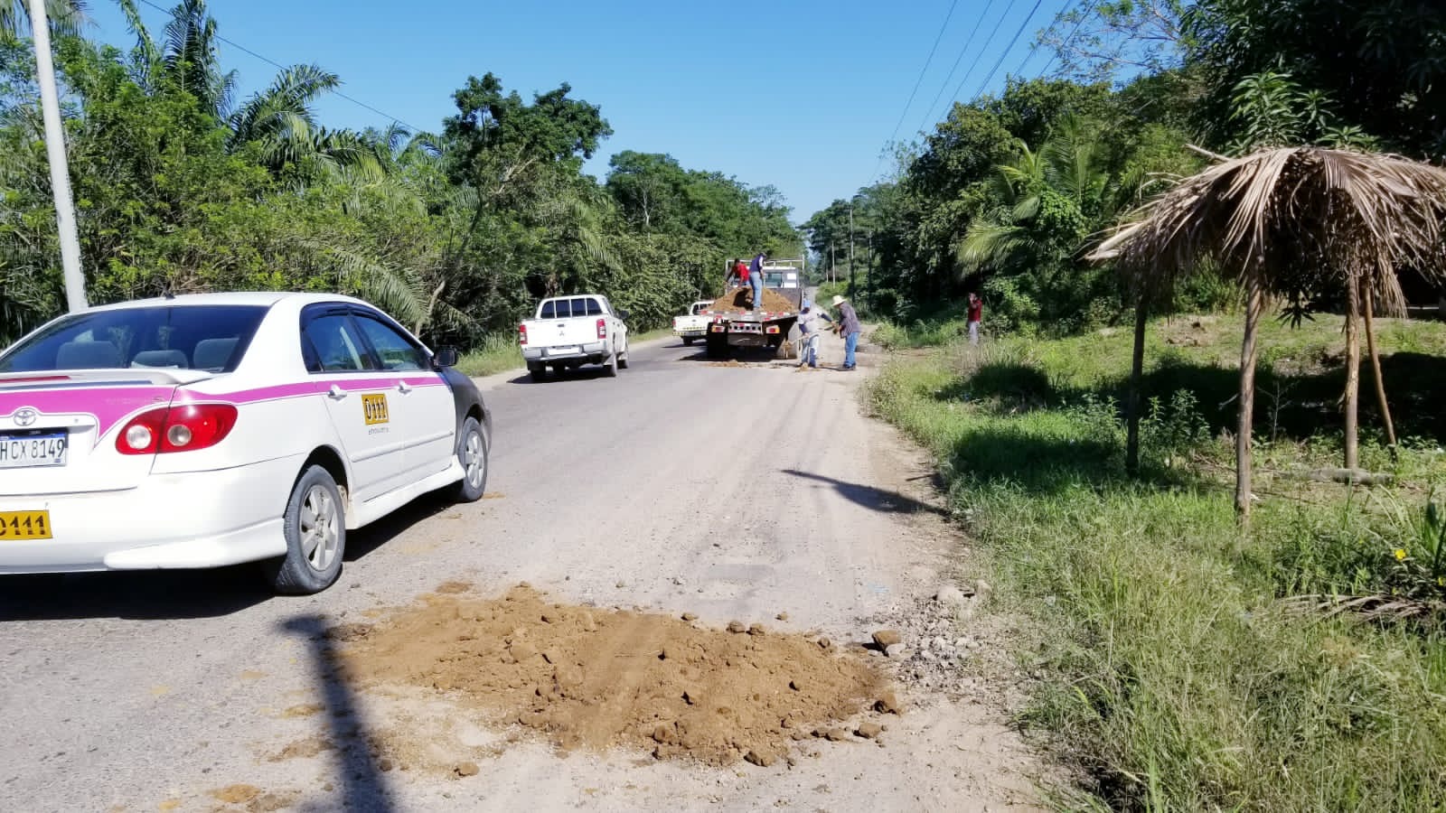 Taujica,Colón.Ante el peligro que hay por los agujeros en la carretera de Tocoa a Trujillo ,pobladores de Taujica están tapando los baches con tierra.