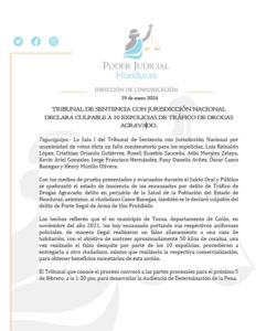 Tegucigalpa [] La Sala I del Tribunal de Sentencia Nacional por unanimidad de votos declaró culpables a 10 expolicias del delito de tráfico de drogas agravado, quienes hace dos años fueron capturados en posesión de 50 kilos de cocaína en la ciudad Tocoa, departamento de Colón.