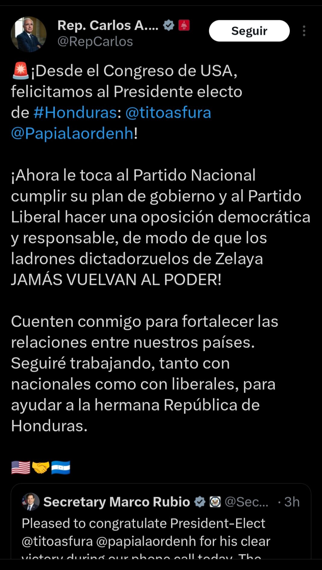 El congresista republicano de Estados Unidos, Carlos Giménez, felicitó públicamente al presidente electo de Honduras, Nasry Asfura, mediante un mensaje difundido en su cuenta oficial de la red social X, en el que también se refirió al panorama político hondureño tras las elecciones generales.