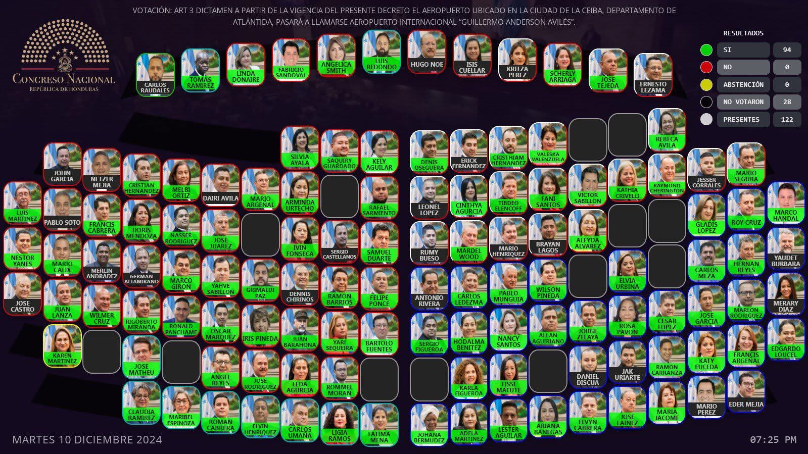 Tegucigalpa- Congreso Nacional aprueba por unanimidad de votos, el decreto orientado a cambiar el nombre del “Aeropuerto Internacional de Golosón, localizado en la ciudad de La Ceiba, departamento de Atlántida, por el nombre de Aeropuerto Internacional “Guillermo Anderson Avilés”.