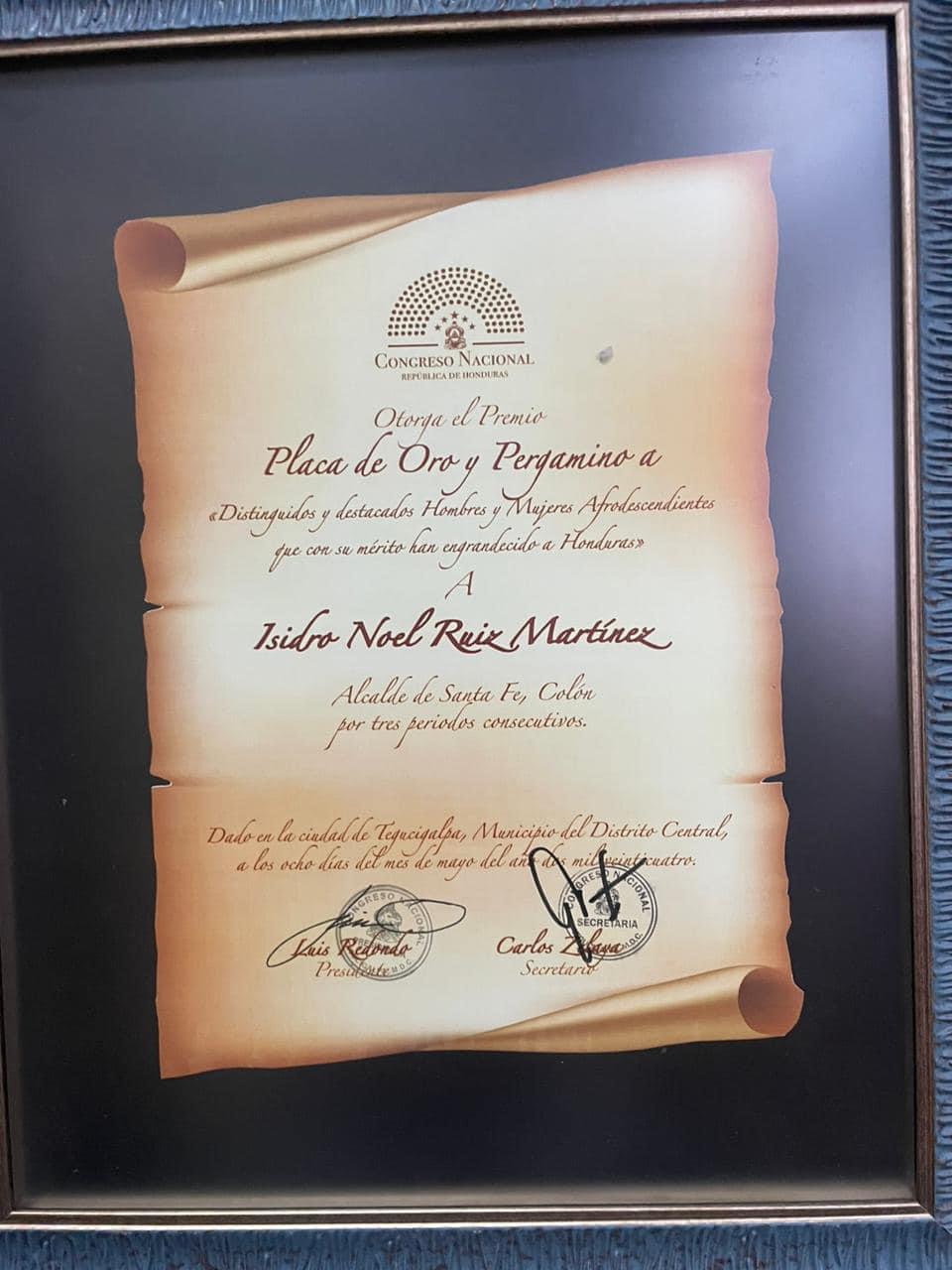 Colón- Isidro Noel Ruiz Alcalde del Municipio de Santa Fe, en este departamento , fue galardonado en el Congreso Nacional de la República, esto debido a su demostrado liderazgo comunitario, su amplia trayectoria política, lo que lo ha llevado ser electo cuatro veces en su cargo como Alcalde y actualmente es el unico Alcalde garífuna en Colón.