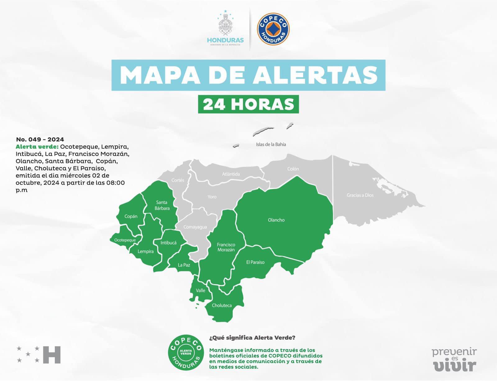 Los departamentos en alerta son: Valle, Choluteca, El Paraíso, Francisco Morazán, Copán, Olancho, La Paz, Intibucá, Lempira, Ocotepeque y Santa Bárbara.
