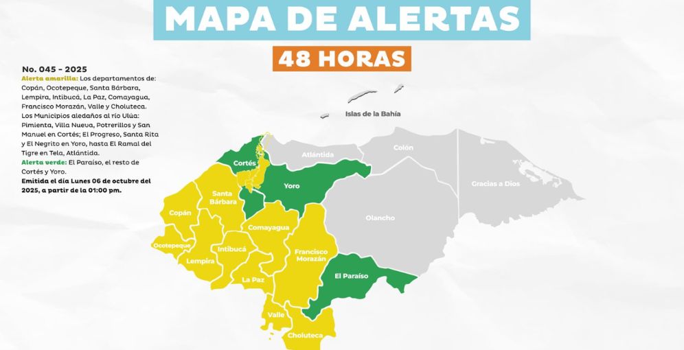 La medida también se extiende a varios municipios cercanos al río Ulúa en los departamentos de Cortés, Yoro y Atlántida, mientras que se mantiene Alerta Verde para El Paraíso y el resto de Cortés y Yoro, por un período de 48 horas a partir de la 1:00 de la tarde del 6 de octubre.