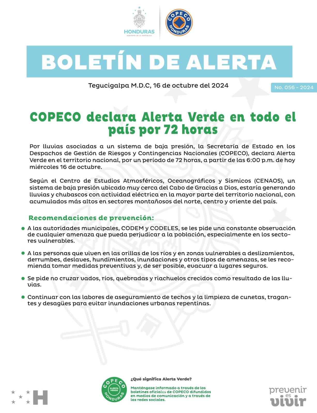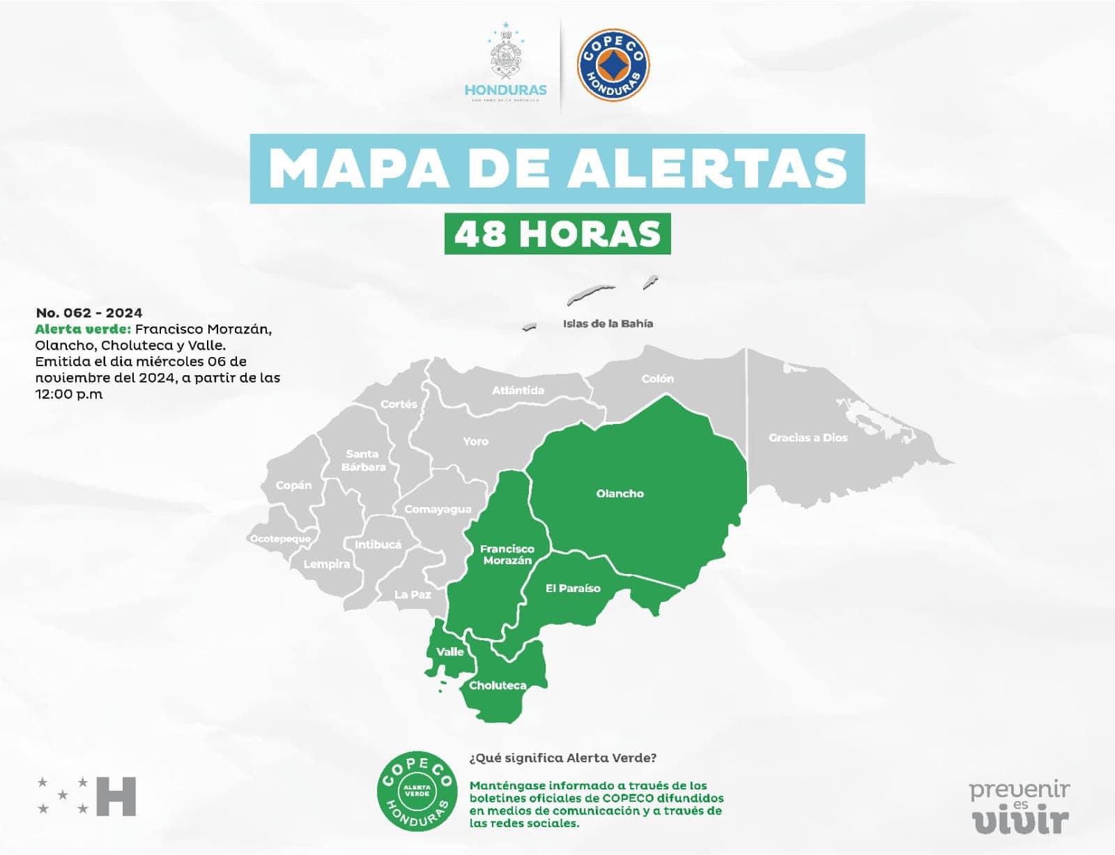 Honduras-Copeco declara Alerta Verde en los departamentos de Francisco Morazán, Valle, Choluteca, El Paraíso y Olancho, por un período de 48 horas.