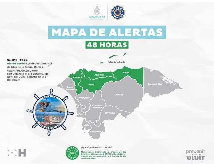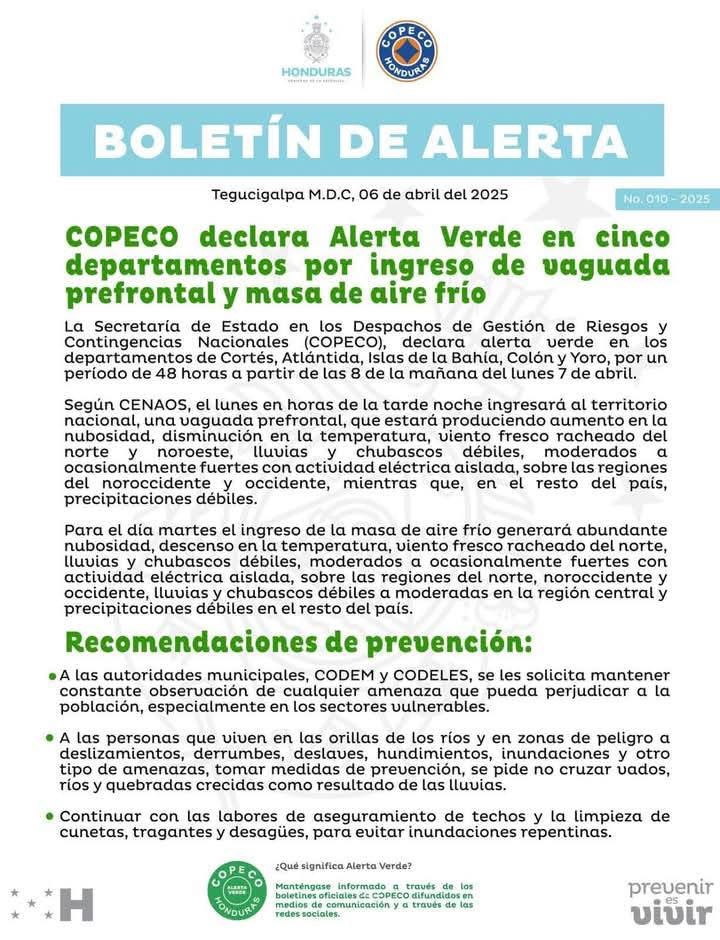 Tegucigalpa- Autoridades de la Secretaria de Estado en los Despachos de Gestión de Riesgos y Contingencias Nacionales (COPECO), emitieron alerta verde en los departamentos de Cortés, Atlántida, Islas de la Bahía, Colón y Yoro, por un período de 48 horas a partir de las 8 de la mañana del lunes 7 de abril, por ingreso de vaguada y una masa de aire frío.