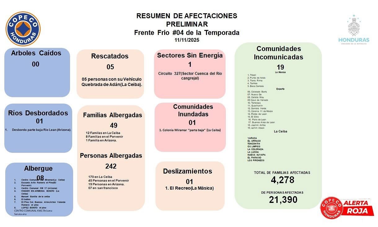 Se contabilizan 49 familias distribuidas en ocho albergues ubicados en La Ceiba, El Porvenir, Arizona y San Francisco. También se reporta el desbordamiento del río Lean, un deslizamiento en La Másica y al menos 19 comunidades incomunicadas.