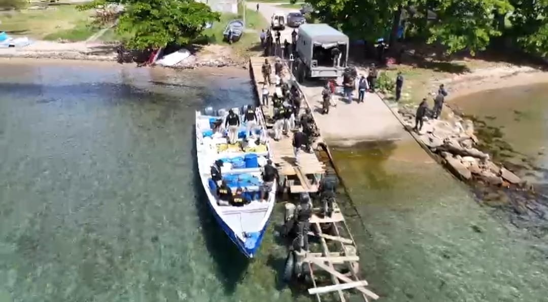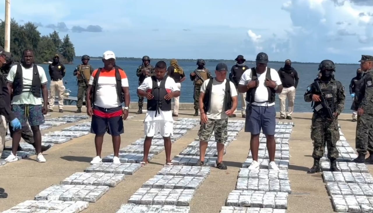 La lancha, junto a los sospechosos y la evidencia llegaron hace instantes a la Estación Naval de Puerto Castilla en Trujillo, Colón, donde técnicos en procesamiento de la escena del crimen de la ATIC realizan la inspección y conteo de la droga.